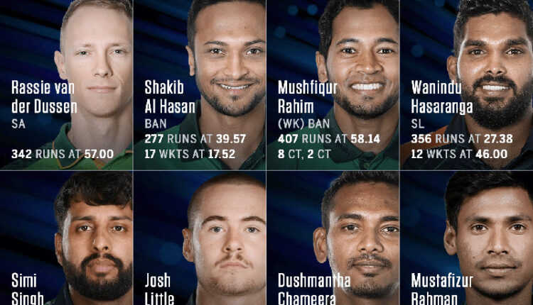 চার নম্বরে ব্যাটিং করতে নামবেন দক্ষিণ আফ্রিকান ব্যাটার রাসি ভ্যান ডার ডুসেন। ৮ ম্যাচ খেলে ৫৭ গড়ে তার সংগ্রহ ৩৪২ রান।তালিকায় পাঁচে রয়েছেন বিশ্বের সেরা অলরাউন্ডার সাকিব আল হাসান। বছরজুড়ে ব্যক্তিগত পারফরম্যান্সে উজ্জ্বল থাকা এই টাইগার অলরাউন্ডার ৯ ম্যাচ খেলে ব্যাট হাতে ৩৯.৫৭ গড়ে করেছেন ২৭৭ রান। বল হাতে নিয়েছেন ১৭ উইকেট। উইকেটরক্ষক হিসেবে তালিকার ছয়ে রাখা বাংলাদেশি ব্যাটার মুশফিকুর রহিম বছড়জুড়ে ৯ ম্যাচ খেলে ব্যাট হাতে ৫৮.১৪ গড়ে করেছেন ৪০৭ রান।