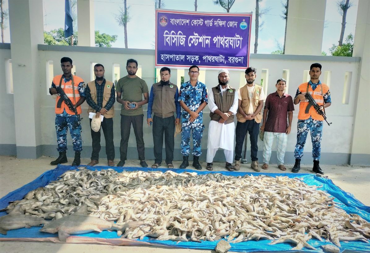 বরগুনার পাথরঘাটায় থেকে বিভিন্ন সাইজের ১০ মণ নিষিদ্ধ হাঙর জব্দ করেছে পাথরঘাটা পথরগাটা কোস্ট গার্ড।