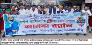 দোয়া মাহফিল, শ্রদ্ধাঞ্জলি ও আনন্দ র্যালিসহ নানা কর্মসূচির মধ্য দিয়ে টাঙ্গাইলে বাংলাদেশ আওয়ামী লীগের সভাপতি প্রধানমন্ত্রী শেখ হাসিনার জন্মদিন পালন করা হয়েছে। বুধবার সকালে জেলা আওয়ামী লীগের উদ্যোগে দলীয় কার্যালয়ে দোয়া মাহফিলের আয়োজন করা হয়। পরে জেলা আওয়ামী লীগের সভাপতি একুশে পদকপ্রাপ্ত বীরমুক্তিযোদ্ধা ফজলুর রহমান খান ফারুক ও সাধারণ সম্পাদক বীরমুক্তিযোদ্ধা জোয়াহেরুল ইসলাম (ভিপি জোয়াহের) এমপির নেতৃত্বে বঙ্গবন্ধুর প্রতিকৃতিত্বে শ্রদ্ধাঞ্জলি জানানো হয়। এরপর প্রধানমন্ত্রী শেখ হাসিনার জন্মদিনের শুভেচ্ছা জানিয়েছে জেলা আওয়ামী লীগের সাধারণ সম্পাদক বীরমুক্তিযোদ্ধা জোয়াহেরুল ইসলাম (ভিপি জোয়াহের) এমপির নেতৃত্বে আনন্দ র্যালি বের করা হয়।