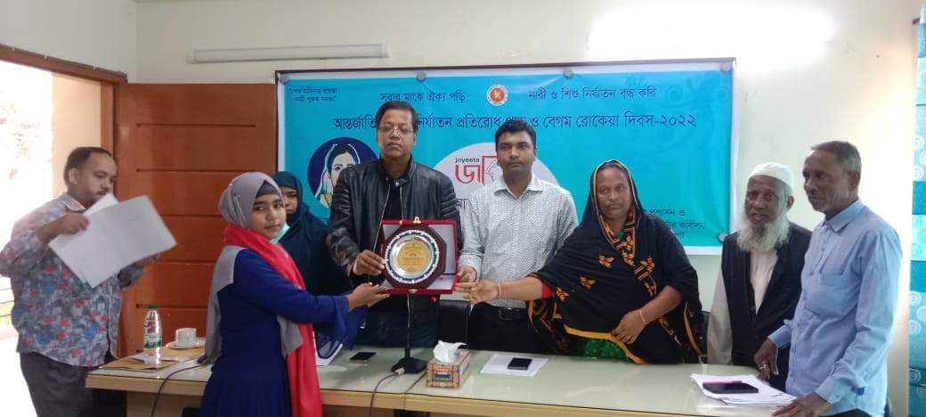 “সবার মাঝে ঐক্য গড়ি নারী ও শিশু নির্যাতন বন্ধ করি”এই প্রতিপাদ্যকে সামনে রেখে সিলেটের গোয়াইনঘাট উপজেলায় নারী জাগরণের পথিকৃৎ বেগম রোকেয়া সাখাওয়াত হোসেনের স্মরণে আন্তর্জাতিক নারী নির্যাতন প্রতিরোধ পক্ষ ও রোকেয়া দিবস উপলক্ষে বিভিন্ন ক্ষেত্রে সাফল্য অর্জন করা নারীদের বিভিন্ন ক্যাটাগরিতে জয়িতা হিসেবে দুইজন নারীকে সম্মাননা ক্রেষ্ট দেওয়া হয়েছে।