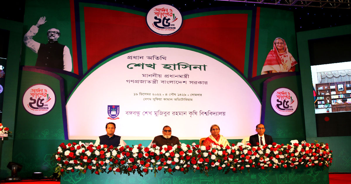 মাননীয় প্রধানমন্ত্রী শেখ হাসিনা এমপি সূচনা বক্তব্যে ২৫তম বিশ্ববিদ্যালয় দিবস ও বশেমুরকৃবি কর্তৃক উদ্ভাবিত প্রযুক্তি প্রদর্শনীর শুভ উদ্বোধন ঘোষনা করেন এবং প্রধান অতিথির ভাষণে বলেন, জাতির পিতা কৃষির প্রতি সর্বাধিক গুরুত্ব দিয়ে সবুজ বিপ্লবের ডাক দিয়েছিলেন। বর্তমান সরকার ফসলের উৎপাদন বৃদ্ধি ও গবেষণায় গুরুত্বারোপ করে কৃষি ভর্তুকী এবং গবেষণায় বিশেষ বরাদ্দ দিয়ে যাচেছ। তিনি খাদ্য উৎপাদন ও খাদ্যের নিরাপত্তায় কৃষি বিশ্ববিদ্যালয়সমূহের ভূমিকার কথা কৃতজ্ঞচিত্তে স্মরণ করেন। তিনি কৃষির অর্থনৈতিক ও বাণিজ্যিক ব্যবহার বৃদ্ধি করে কৃষি উৎপাদন বৃদ্ধি এবং সংরক্ষণের উপর বিশেষ গুরুত্বারোপ করেন। বঙ্গবন্ধু শেখ মুজিবুর রহমান কৃষি বিশ্ববিদ্যালয়ের ২৫ বছরের সাফল্য ও অর্জনে তিনি নিজে গর্বিত এবং এজন্য বিশ্ববিদ্যালয় পরিবারের সকলকে আন্তরিক অভিনন্দন ও ধন্যবাদ জানান।