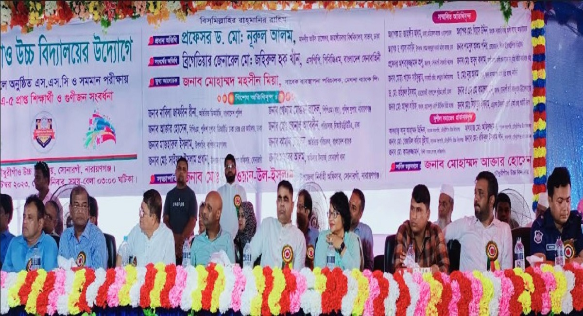 সোনারগাঁওয়ে চৌধুরীগাঁও উচ্চ বিদ্যালয়ের ২০২৩ সালে জিপিএ-৫ প্রাপ্ত কৃতি শিক্ষার্থী ও গুণীজন সংবর্ধনা অনুষ্ঠিত হয়েছে। ২ সেপ্টেম্বর শনিবার বিকেলে নারায়ণগঞ্জের সোনারগাঁয়ে উপজেলার শম্ভুপুরা ইউনিয়নে চৌধুরীগাঁও উচ্চ বিদ্যালয়ে ২০২৩ সালে অনুষ্ঠিত এস.এস.সি সমমান পরীক্ষায় জিপিএ -৫ প্রাপ্ত শিক্ষার্থীদের মাঝে গুনীজন সংবর্ধনা প্রদান অনুষ্ঠানের আয়োজন করা হয়। সোনারগাঁও উপজেলার নির্বাহী অফিসার মো.রেজওয়ান-উল ইসলামের সভাপতিত্বে প্রধান অতিথি হিসেবে উপস্থিত ছিলেন জাহাঙ্গীর নগর বিশ্ববিদ্যালয়ের ভাইস চ্যান্সেলর প্রফেসর ড.মো. নুরুল আলম, সংবর্ধেয় অতিথি ছিলেন এসপিপি পিবিজিএম বাংলাদেশ সেনাবাহিনীর ব্রিগেডিয়ার জেনারেল মো.জহিরুল হক খাঁন, মুখ্য আলোচক মেঘনা ব্যাংক লিঃ এর সাবেক ব্যাবস্হাপনা পরিচালক মোহাম্মদ মহসিন মিয়া। বিশেষ অতিথি ছিলেন বাংলাদেশ পুলিশের , অতিরিক্ত ডিআইজি নাবিলা জাফরিন রীনা,নারায়ণগঞ্জ জেলা পুলিশ সুপার পিপিএম (বার) গোলাম মোস্তফা রাসেল, ডিআইজি ঢাকা রেঞ্জ এর কার্যালয় পুলিশ সুপার পিপিএম (বার) আক্তার হোসেন, বাংলাদেশ ব্যাংকের অতিরিক্ত পরিচালক কামাল হোসেন, উপজেলা মাধ্যমিক শিক্ষা অফিসার মো.সাইফুল ইসলাম, সোনারগাঁও থানার অফিসার ইনচার্জ মো.মাহবুব আলম সুমন। আয়োজনে অত্র বিদ্যালয়ের সভাপতি মোহাম্মদ আক্তার হোসেন ও ভারপ্রাপ্ত প্রধান শিক্ষক মো.জিয়াউর রহমান প্রমূখ। এসময় সোনারগাঁও উপজেলার বিভিন্ন উচ্চ বিদ্যালয়ের প্রধান শিক্ষক ও অধ্যক্ষগণ এবং কৃতি শিক্ষার্থীরা উপস্থিত ছিলেন।