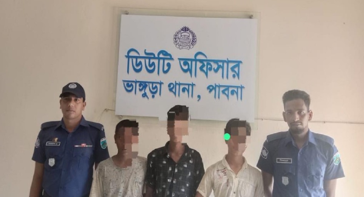 ফটো ক্যাপশন- ভাঙ্গুড়া(পাবনা): পুলিশের হাতে আটক কিশোর গ্যাংয়ের তিন সদস্য। রবিবার ছবিটি তোলা হয়।