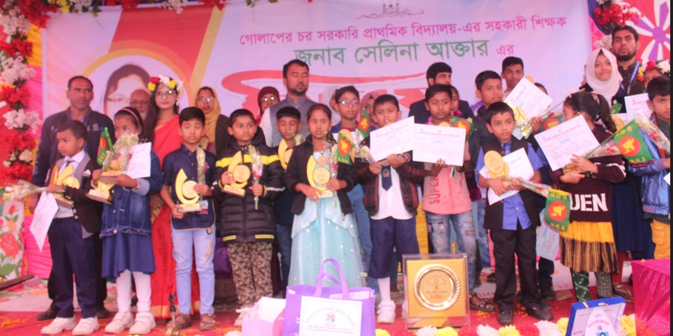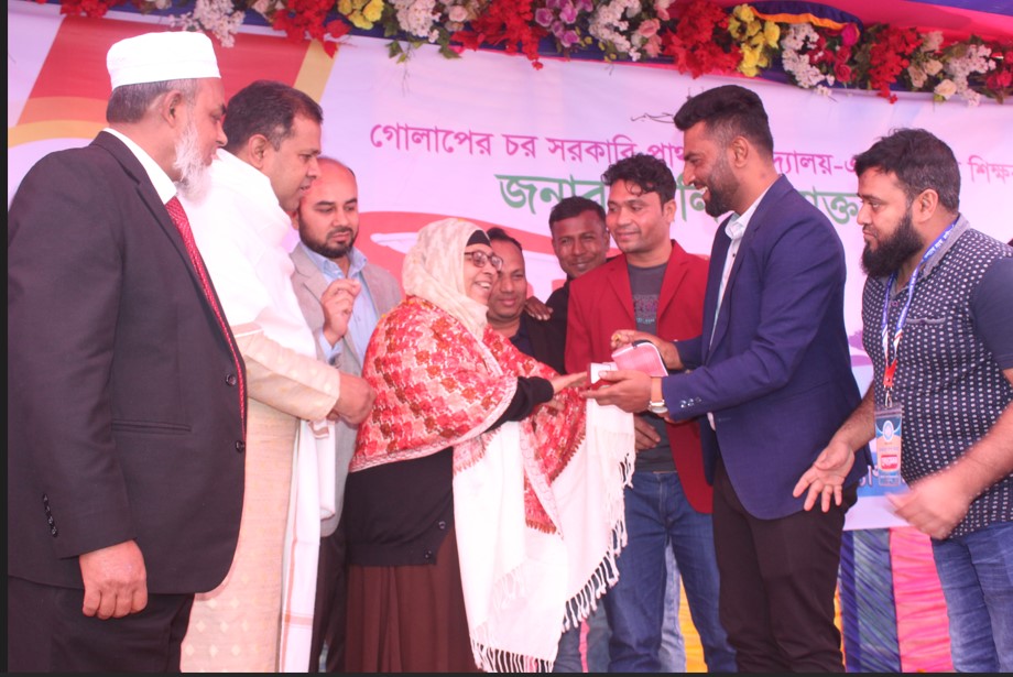 ব্যাপক সাজসজ্জা এবং বর্ণাঢ্য শোভাযাত্রার মাধ্যমে বিদায় সংবর্ধনা দেওয়া হয়েছে। গোলাপের চর সরকারি প্রাথমিক বিদ্যালয়ে এ ব্যতিক্রমী বিদায়ী অনুষ্ঠানের আয়োজন করা হয়।
