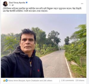 তিনি লিখেছেন, ‘টেলিভিশন নাটকের জনপ্রিয় মুখ অলিউল হক রুমি ভাই কিছুক্ষণ আগে মারা গেছেন। ইন্না লিল্লাহি ওয়া ইন্না ইলাইহি রাজিউন। সবাই তার জন্য দোয়া করবেন।’