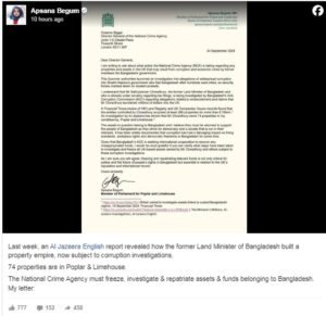 চিঠিতে এসব বিষয় উল্লেখ করে আপসানা বেগম বলেন, বাংলাদেশের সাবেক ভূমিমন্ত্রী সাইফুজ্জামান চৌধুরীর বিরুদ্ধে কর জমা সংক্রান্ত তদন্ত চলছে। অর্থ আত্মসাতের অভিযোগে তার বিরুদ্ধে তদন্ত করছে বাংলাদেশের দুর্নীতি দমন কমিশন (দুদক)। সংস্থাটি দাবি করেছে, সাইফুজ্জামান চৌধুরী যুক্তরাজ্যে কোটি কোটি ডলার পাচার করেছেন।
