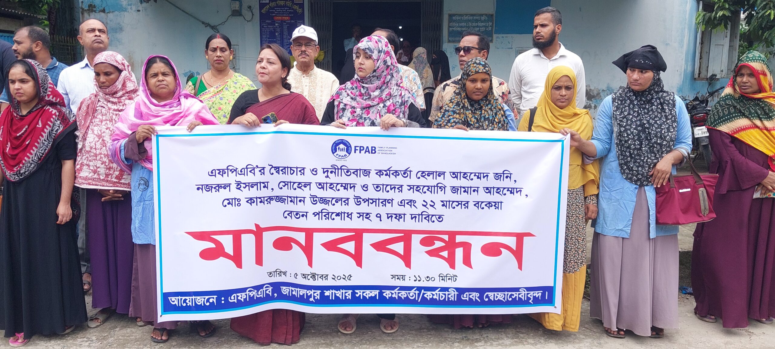 পরিবার পরিকল্পনা সমিতি (এফপিএবির) স্বৈরাচার ও দূর্নীতিবাজ কর্মকর্তা হেলাল আহম্মেদ জনি, নজরুল ইসলাম, সোহেল আহম্মেদ তাদের সহযোগি জামান আহম্মেদ, কামরুজ্জামান উজ্জ্বলের অপসারণ এবং ২২মাসের বকেয়া বেতন পরিশোধসহ ৭দফা দাবীতে জামালপুরে মানববন্ধন করেছে এফপিএবির কর্মকর্তা কর্মচারীরা।