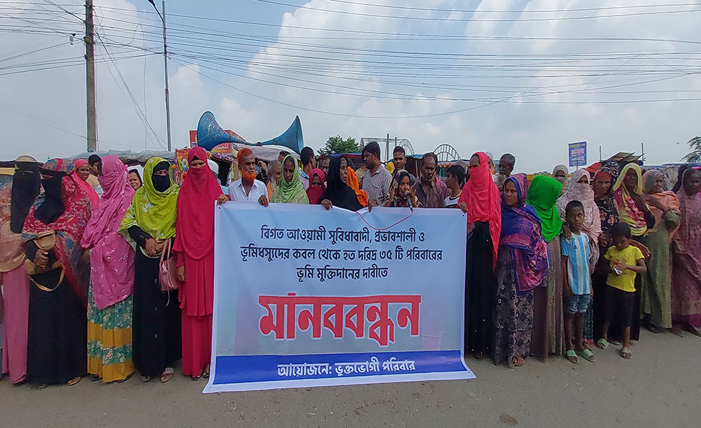 জামালপুরে আওয়ামী সুবিধাবাদী, প্রভাবশালী ও ভূমিদস্যুদের কবল থেকে ভূমি উদ্ধারের দাবীতে মানববন্ধন ও স্মারক লিপি প্রদান করেছে ভূক্তভোগী কৃষকরা। রবিবার (১২ অক্টোবর) দুপুরে শহরের ফৌজদারী মোড়ে ভূক্তভোগী ৩৫টি পরিবারের সদস্যরা এই কর্মসুচির আয়োজন করে।