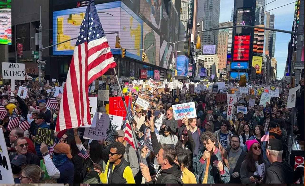 সংবাদমাধ্যমটি বলছে, যুক্তরাষ্ট্রের নিউইয়র্ক, ওয়াশিংটন ডিসি, শিকাগো, মায়ামি ও লস অ্যাঞ্জেলেসসহ দেশজুড়ে লাখো মানুষ প্রেসিডেন্ট ডোনাল্ড ট্রাম্পের বিরুদ্ধে বিক্ষোভে অংশ নিয়েছেন। স্থানীয় সময় শনিবার সকাল থেকেই শুরু হওয়া এই “নো কিংস” আন্দোলন দ্রুতই জনস্রোতে পরিণত হয়।