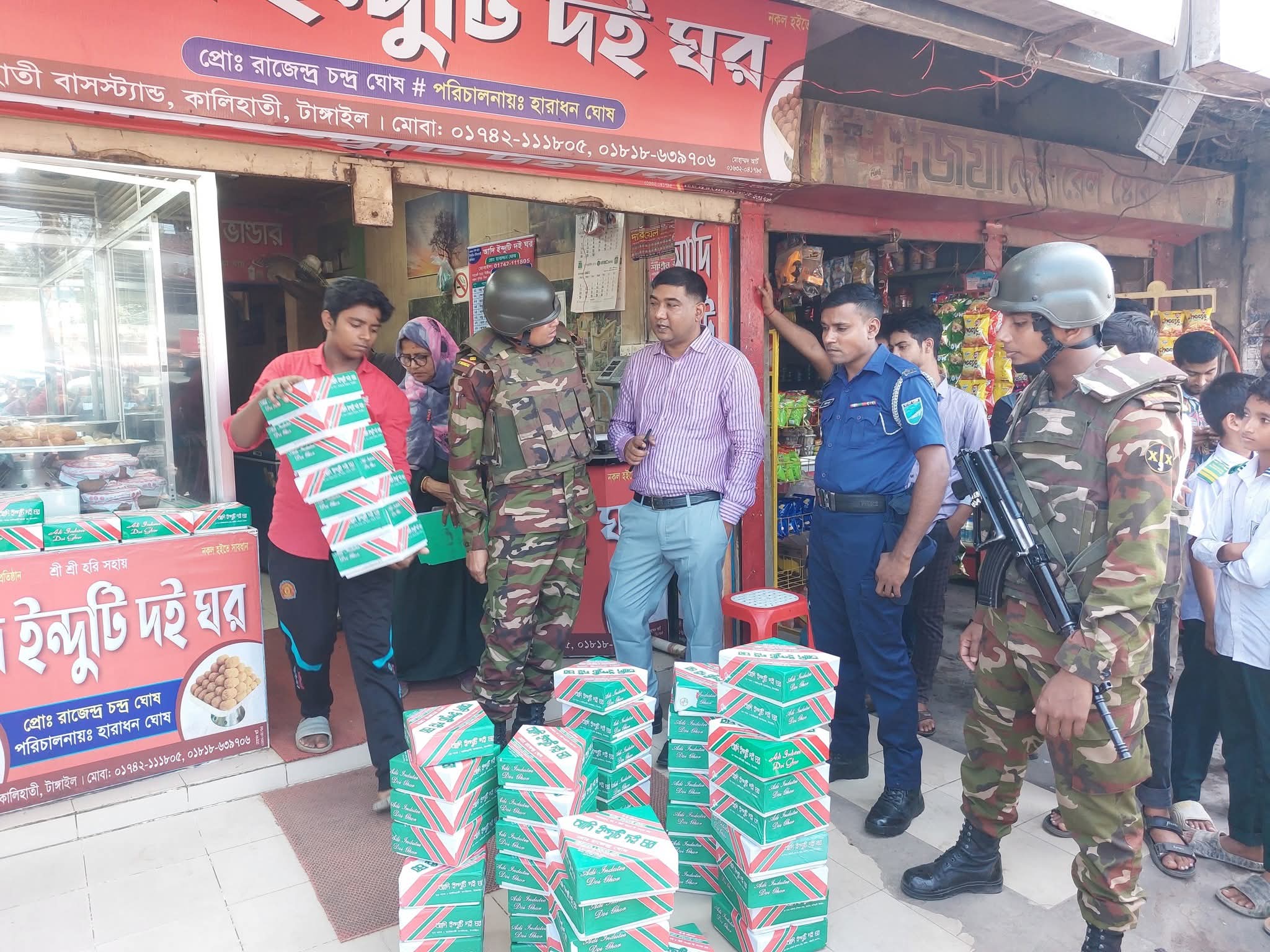 জাতীয় ভোক্তা অধিকার সংরক্ষণ অধিদপ্তরের সহকারী পরিচালক আসাদুজ্জামান রুমেল জানান, সুনির্দিষ্ট তথ্যের ভিত্তিতে কালিহাতীর বিভিন্ন এলাকায় অভিযান পরিচালনা করা হয়। অস্বাস্থ্যকর পরিবেশে খাদ্যপণ্য প্রস্তুত, বাসি খাবার বিক্রয় ও পরিমাপে কম দেওয়ার অপরাধে কালিহাতী বাসস্ট্যান্ড এলাকার পিয়াসী হোটেলকে ৫০ হাজার টাকা এবং ক্ষতিকর রঙ ও কেমিক্যাল দিয়ে খাদ্যপণ্য প্রস্তুত করার অপরাধে এলেঙ্গা বাসস্ট্যান্ড এলাকার এসএস ফুড মালিককে ২০ হাজার টাকা জরিমানা করা হয়। এছাড়াও ২৩৫- ২৭৫ গ্রাম ওজনের বিপুল সংখ্যক মিষ্টির প্যাকেট ধ্বংস করা হয়েছে। জনস্বার্থে এ ধরনের অভিযান অব্যাহত থাকবে বলে তিনি জানান।