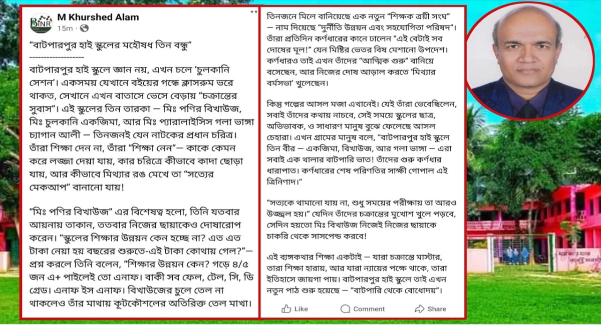 পোস্টে তিনি লিখেন, ‘বাটপারপুর হাই স্কুলে জ্ঞান নয়, এখন চলে চুলকানি সেশন। এক সময় যেখানে বইয়ের গন্ধে ক্লাসরুম ভরে থাকত, এখন সেখানে বাতাসে ভেসে বেড়ায় চক্রান্তের সুবাস। এই স্কুলের তিন তারকা মি. পণির বিখাউজ, মি. চুলকানি একজিমা, আর মি. প্যারালাইসিস গলা ভাঙা চ্যাগান আলী তিনজনই যেন নাটকের প্রধান চরিত্র।