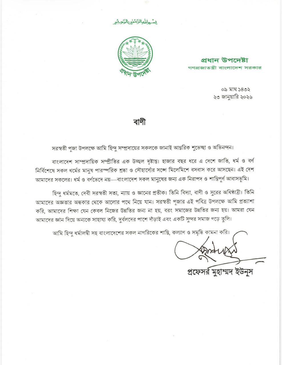 ড. ইউনূস বলেন, সরস্বতী পূজার এই পবিত্র উপলক্ষে আমি প্রত্যাশা করি, আমাদের শিক্ষা যেন কেবল নিজের উন্নতির জন্য না হয়, বরং সমাজের উন্নতির জন্য হয়। আমরা যেন আমাদের জ্ঞান দিয়ে অন্যকে সাহায্য করি, দুর্বলদের পাশে দাঁড়াই এবং একটি সুন্দর সমাজ গড়ে তুলি।