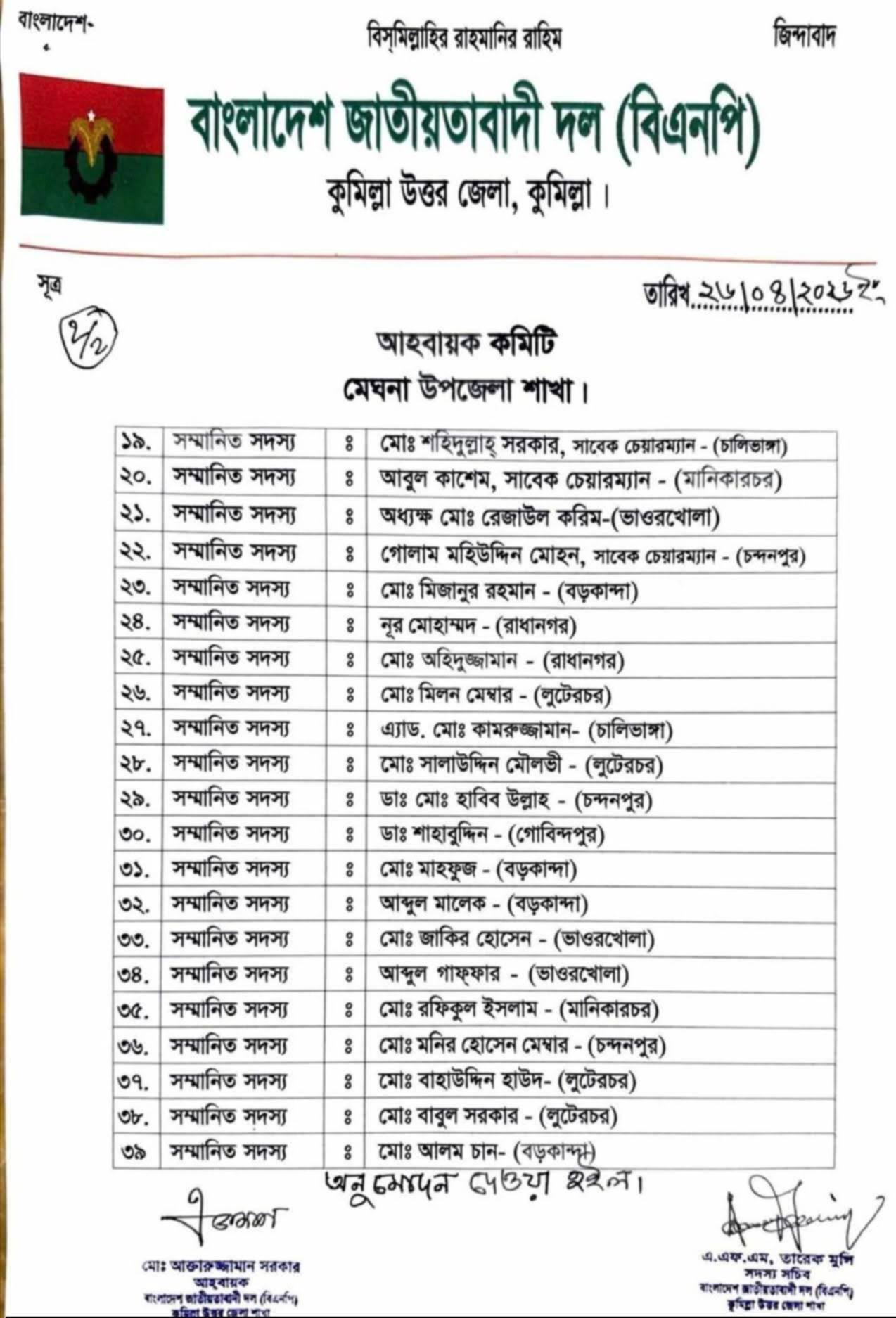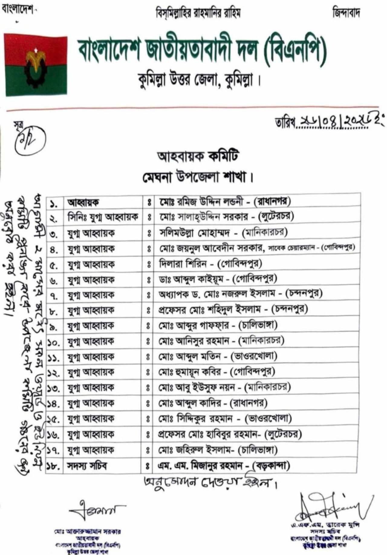 কুমিল্লার মেঘনা উপজেলা বিএনপির নতুন আহ্বায়ক কমিটি অনুমোদন করা হয়েছে।
