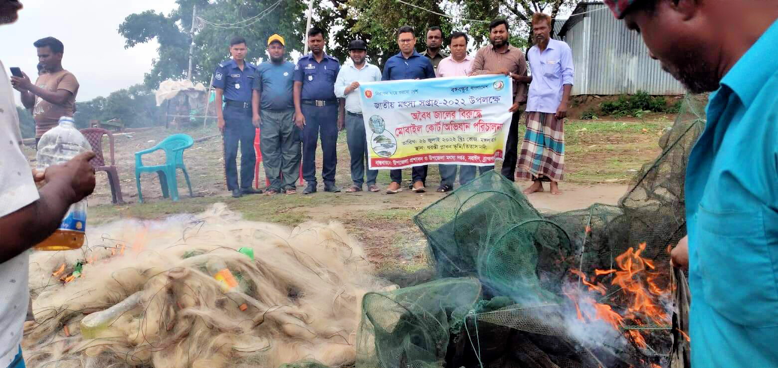 ব্রাহ্মণবাড়িয়ার সরাইল উপজেলার শাহবাজপুর তিতাস নদীতে ভ্রাম্যমাণ আদালতে বিশেষ অভিযানে ৩০ হাজার মিটার কারেন্ট জাল ও আশি সেট রিংজাল উদ্ধার