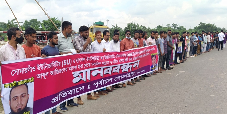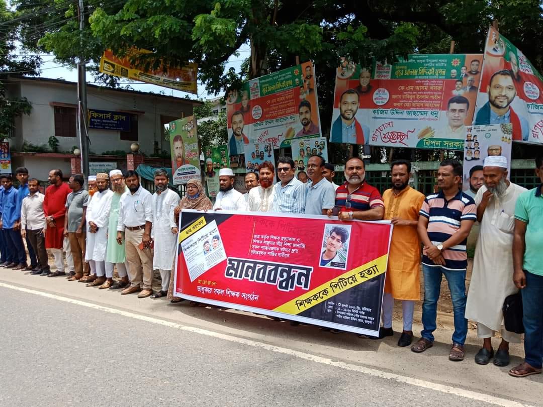 শিক্ষক হত্যা ও লাঞ্ছিতের প্রতিবাদে ভালুকায় মানববন্ধন