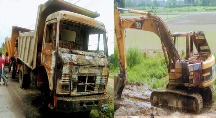 আড়াইহাজারে দুটি ড্রাম ট্রাক ও একটি বেকু পুড়িয়ে দিয়েছে দুর্বৃত্তরা