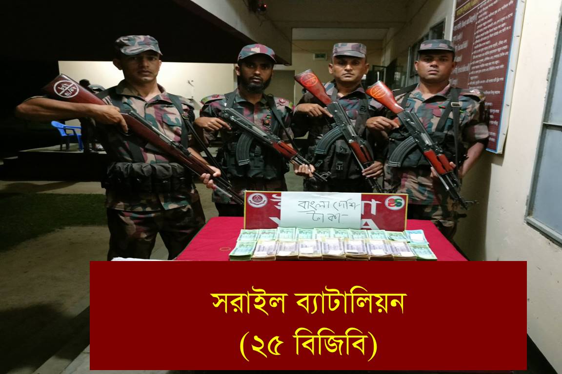 সরাইল ব্যাটালিয়ন (২৫ বিজিবি) এর আওতাধীন হবিগঞ্জ জেলার মাধবপুর উপজেলার সীমান্ত হতে ১৮ লাখ টাকা ভারত থেকে পাচার করে আনা