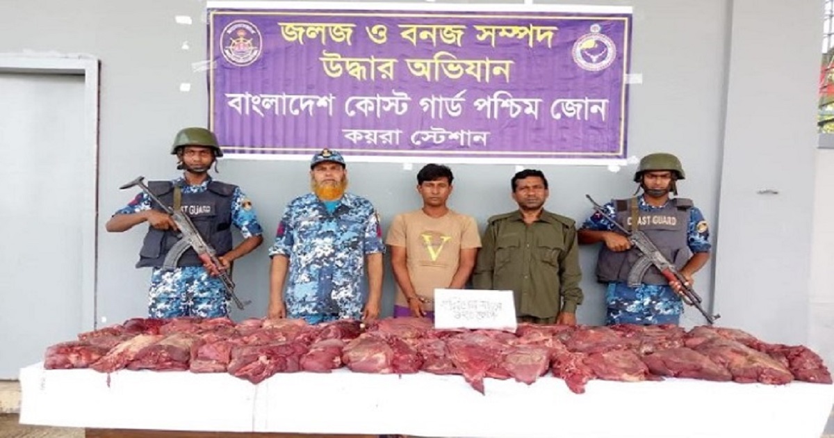 খুলনা জেলার কয়রা থানাধীন পূর্ব ঘড়িলাল এলাকায় কোস্ট গার্ডের অভিযানে ১২০ কেজি হরিণের মাংসসহ ১ পাচারকারী আটক। সোমবার ১৭ এপ্রিল