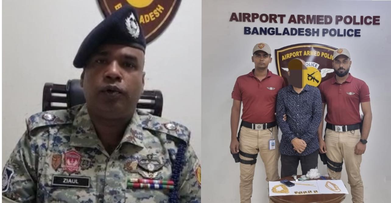 শাহজালাল আন্তর্জাতিক বিমানবন্দরে সিভিল অ্যাভিয়েশনের গাড়ি চালক সালেহকুজ্জামানকে ৫টি সোনারবার ও ৫০টি স্বর্ণের চেইনসহ আটক করেছে বিমানবন্দর আর্মড পুলিশ ব্যাটালিয়ন