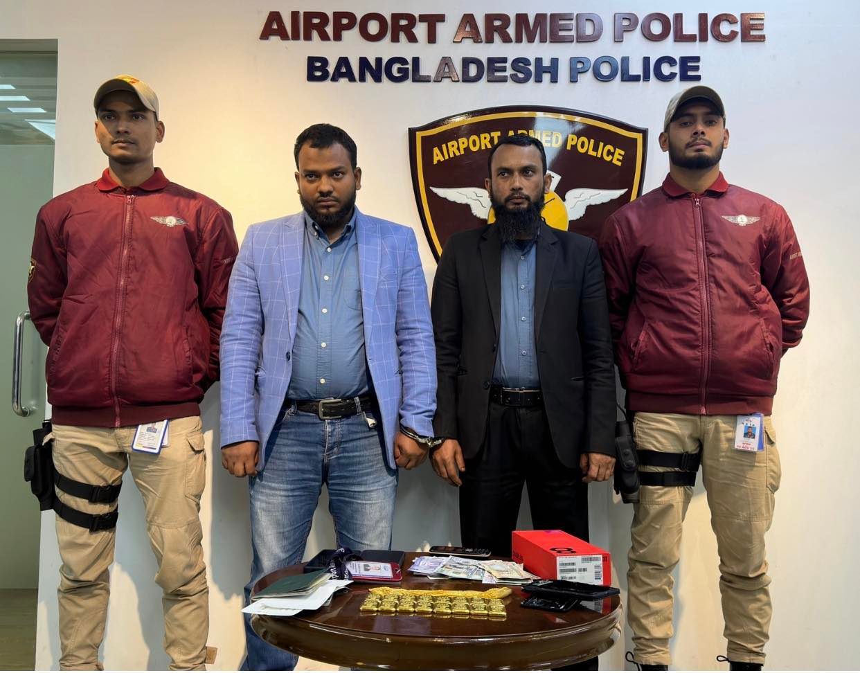 হযরত শাহজালাল আন্তর্জাতিক বিমানবন্দরে প্রায় ২ কেজি স্বর্ণ সহ একজন হেল্পলাইন স্টাফ এবং একজন যাত্রীকে আটক করেছে এয়ারপোর্ট আর্মড পুলিশ