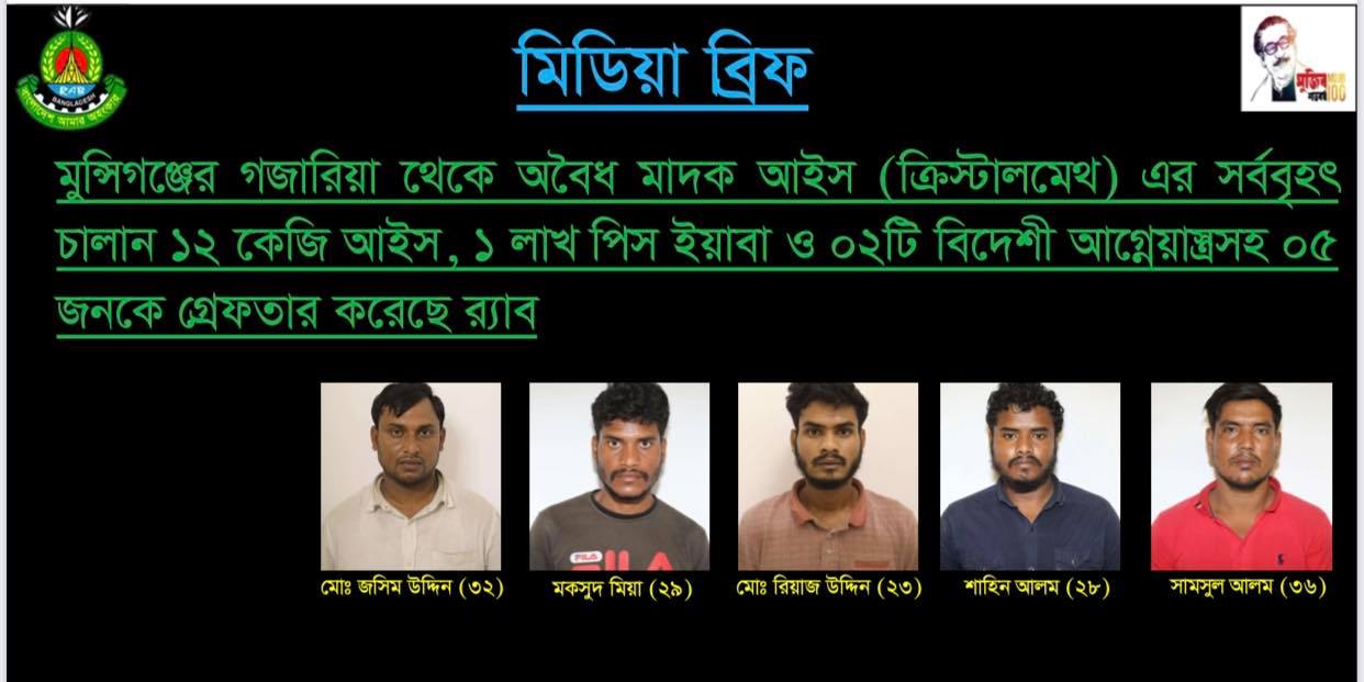 অবৈধ মাদক আইস ১২ কেজি বিদেশী আগ্নেয়াস্ত্রসহ গ্রেফতার ৫