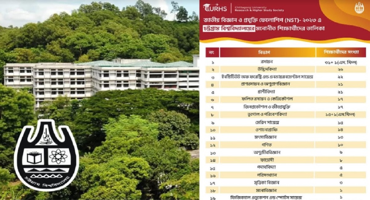 চট্টগ্রাম বিশ্ববিদ্যালয়ের ( চবি) ১৯ টি বিভগের ২৫৬ জন শিক্ষার্থী ‘জাতীয় বিজ্ঞান ও প্রযুক্তি ফেলোশিপ’ ‘র জন্য নির্বাচিত হয়েছেন। ২০২৩-২৪
