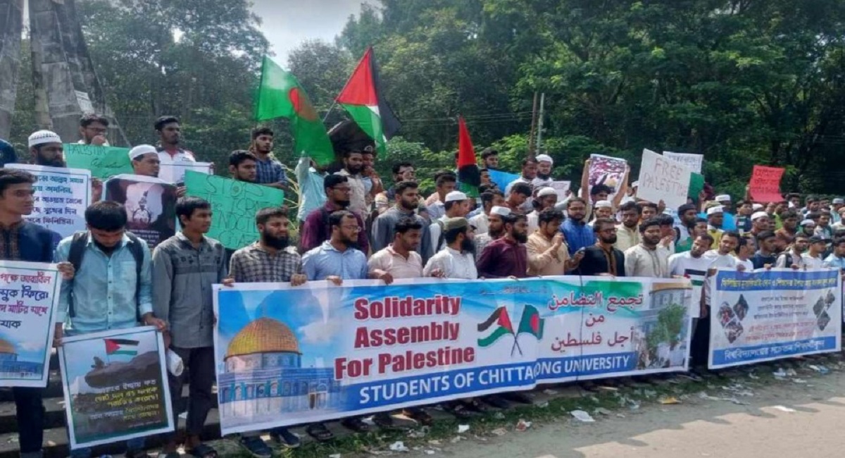 দখলদার ইসরায়েল ও ফিলিস্তিনের মধ্যে চলমান সংঘর্ষে ফিলিস্তিনের প্রতি সংহতি জানিয়ে সমাবেশ ও মানববন্ধন করেছে চট্টগ্রাম বিশ্ববিদ্যালয়ের শিক্ষার্থীরা। রোববার (১৫