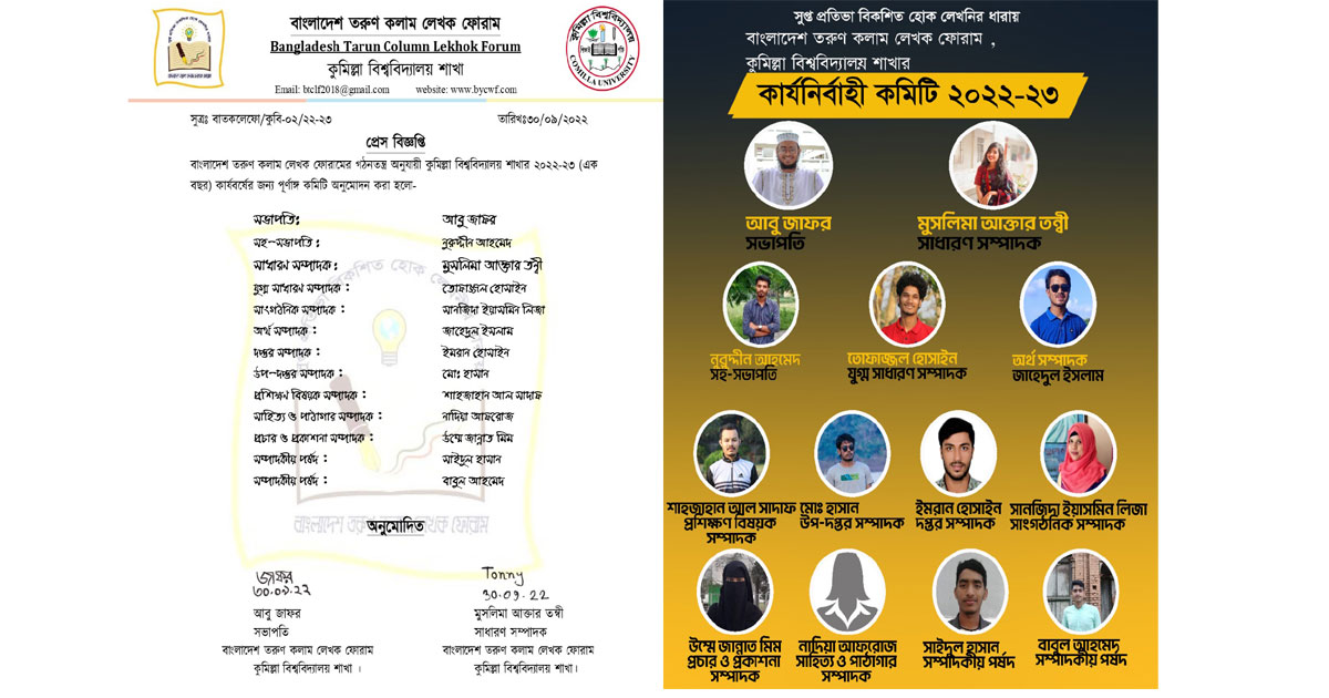 কুমিল্লা বিশ্ববিদ্যালয়ে (কুবি) বাংলাদেশ তরুণ কলাম লেখক ফোরাম ২০২২-২৩ বর্ষের পূর্ণাঙ্গ কমিটি ঘোষিত হয়। শুক্রবার (৩০ সেপ্টেম্বর) বাংলাদেশ তরুণ কলাম