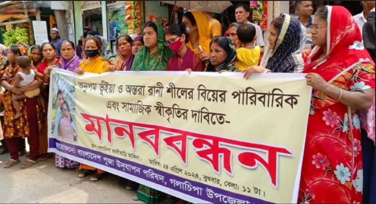 পটুয়াখালীর গলাচিপায় স্ত্রী’র স্বিকৃতির দাবীতে বাংলাদেশ পূ্জা উদযাপন পরিষদের আয়োজনে কেন্দ্রীয় কালিবাড়ি মন্দিরের সামনে ২৪ এপ্রিল বুধবার বেলা ১১ টার