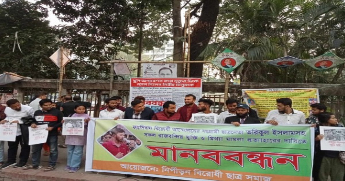 জাতীয় প্রেসক্লাবের সামনে ফ্যাসিবাদ বিরোধী আন্দোলনের সংগ্রামী ছাত্রনেতা তরিকুল ইসলামসহ সকল রাজবন্দির মুক্তি ও মিথ্যা মামলা প্রত্যাহারের দাবিতে মানববন্ধন করে।