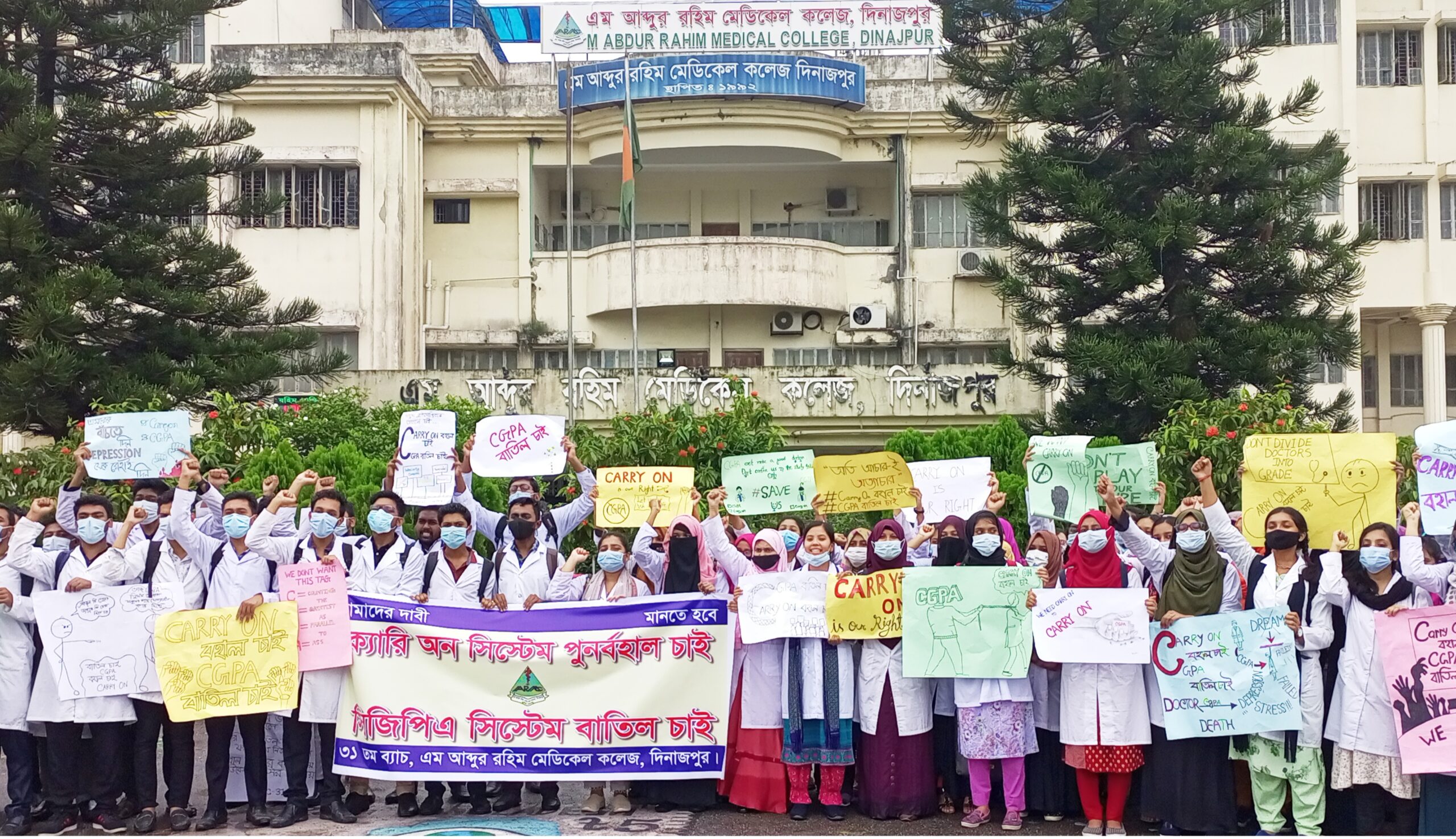 ক্যারি অন সিস্টেম পুর্নবহাল ও সিজিপিএ সিস্টেম বাতিলের দাবীতে বিক্ষোভ ও মানববন্ধন করেছে দিনাজপুর এম আব্দুর রহিম মেডিকেল কলেজের