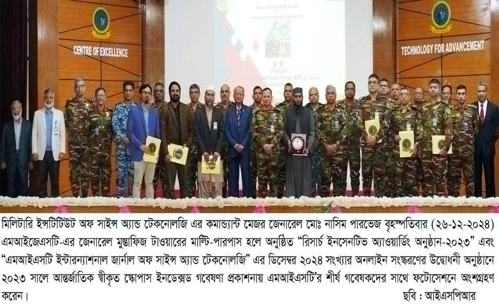 মিলিটারি ইন্সটিটিউট অফ সাইন্স অ্যান্ড টেকনোলজি (এমআইএসটি)-এর জেনারেল মুস্তাফিজ টাওয়ারের মাল্টি-পারপাস হলে “রিসার্চ ইনসেনটিভ অ্যাওয়ার্ডিং অনুষ্ঠান-২০২৩” এবং “এমআইএসটি ইন্টারন্যাশনাল জার্নাল