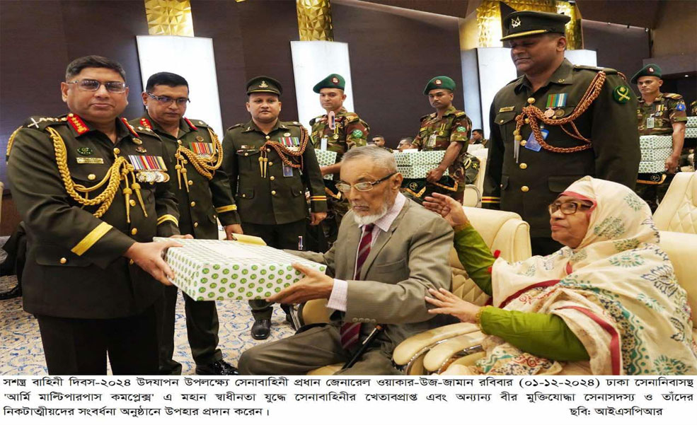 সশস্ত্র বাহিনী দিবস-২০২৪ উদযাপন উপলক্ষ্যে রবিবার (০১-১২-২০২৪) ঢাকা সেনানিবাসস্থ ‘আর্মি মাল্টিপারপাস কমপ্লেক্স’ এ মহান স্বাধীনতা যুদ্ধে সেনাবাহিনীর খেতাবপ্রাপ্ত এবং অন্যান্য