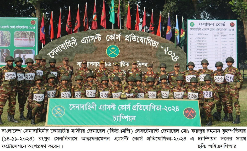 বৃহস্পতিবার (১৪-১১-২০২৪) বাংলাদেশ সেনাবাহিনী এ্যাসল্ট কোর্স প্রতিযোগিতা-২০২৪ এর সমাপনী অনুষ্ঠান রংপুর সেনানিবাসে অনুষ্ঠিত হয়। অনুষ্ঠানে বাংলাদেশ সেনাবাহিনীর কোয়ার্টার মাস্টার জেনারেল