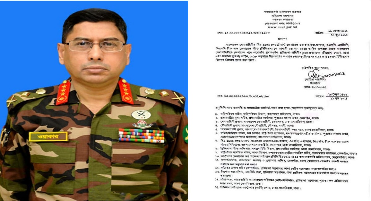সেনাবাহিনীর প্রধান হিসেবে নিয়োগ পেয়েছেন লেফটেন্যান্ট জেনারেল ওয়াকার-উজ-জামান।মঙ্গলবার (১১ জুন) আন্তবাহিনী জনসংযোগ পরিদপ্তর (আইএসপিআর) এক বিজ্ঞপ্তিতে এ তথ্য জানিয়েছে। এতে