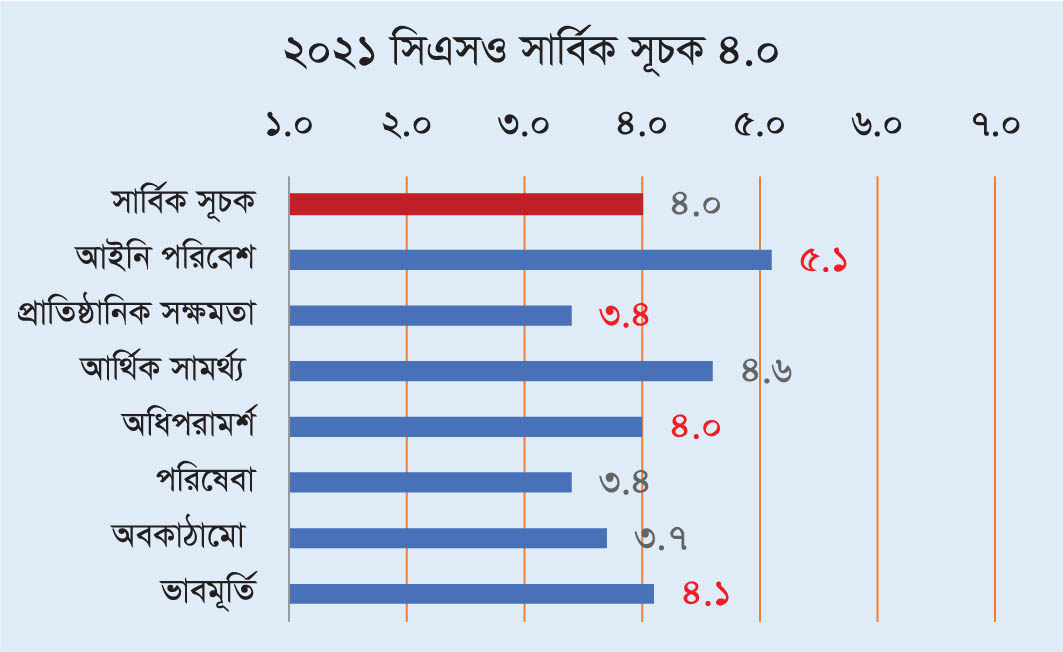 নাগরিক সংগঠনগুলোর বৈশ্বিক স্থায়িত্বশীলতা সূচকে বাংলাদেশের অবস্থান ২০২১ সালেও আগের বছেরর মতো সংকুচিত থেকে গেছে। গত বুধবার প্রকাশিত সিভিল সোসাইটি