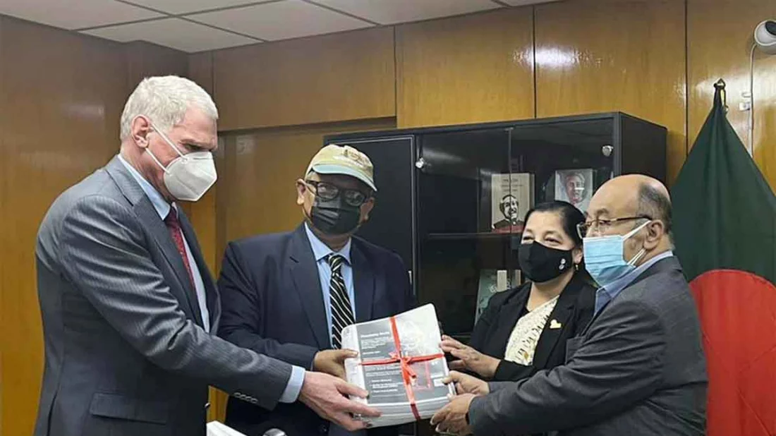 শিল্পমন্ত্রীর কাছে পটুয়াখালীতে আন্তর্জাতিক মানের জাহাজ নির্মাণ কারখানা স্থাপনের লক্ষে সম্ভাব্যতা যাচাই প্রতিবেদন উপস্থাপন করা হয়। ছবি: পিআইডিশিল্পমন্ত্রীর কাছে পটুয়াখালীতে