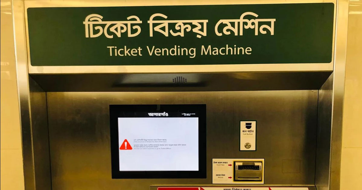 মেট্রোরেলে টিকিট বিক্রয় মেশিন (ভেন্ডিং মেশিন) সাময়িকভাবে বিকল হয়ে গেছে। বৃহস্পতিবার, ২৯ ডিসেম্বর ৮টা ৩৫ মিনিটে যাত্রীরা প্রবেশ করে টিকিট