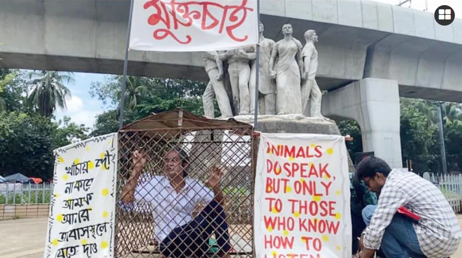 লোহার খাঁচায় বন্দি মানুষ, অবাক হচ্ছেন! সত্যি ঘটনা। রাজধানীর সবচেয়ে কোলাহলময় স্থান ঢাকা বিশ্ববিদ্যালয়ের টিএসসিতে শনিবার (২০ আগস্ট) দুপুরে এমন