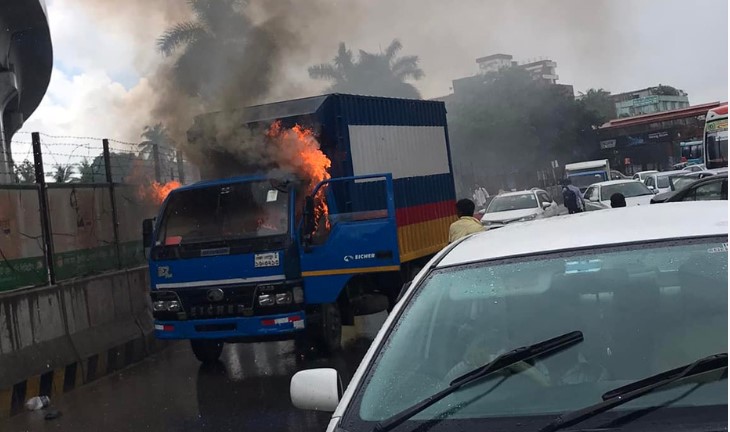 রাজধানীতে চলন্ত কাভার্ডভ্যানে আগুন