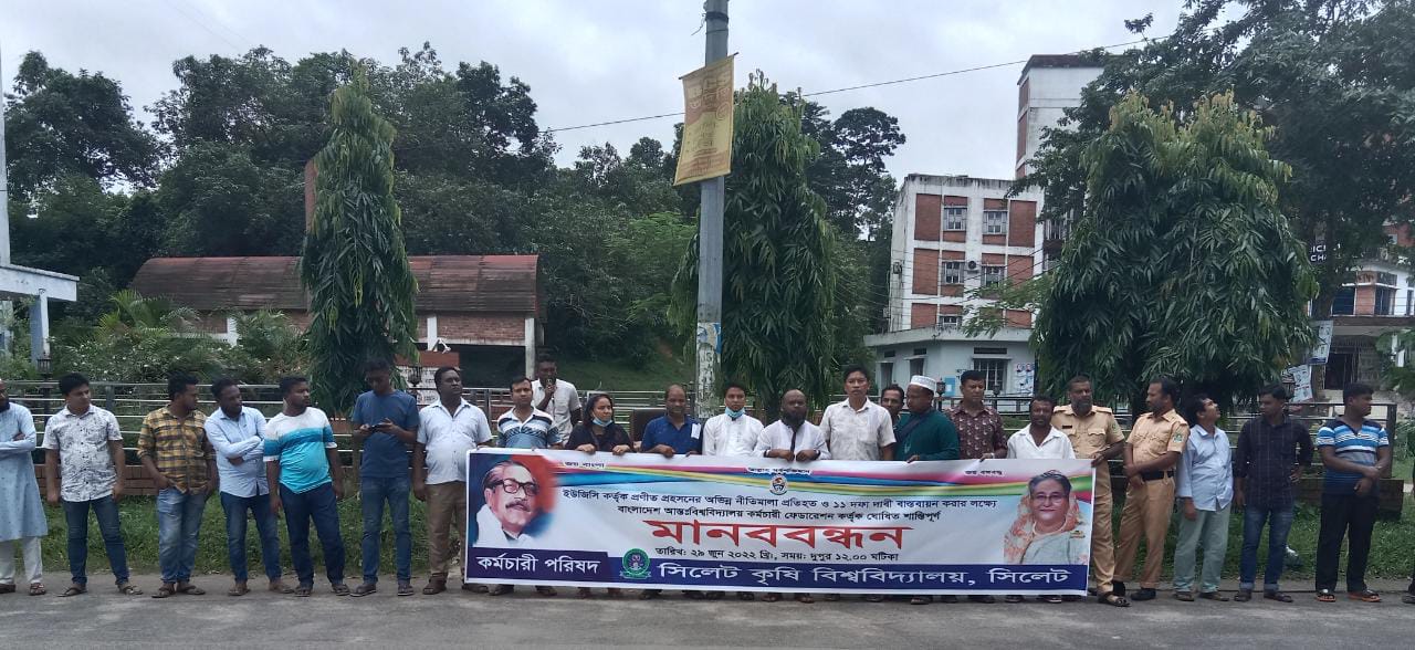 সকল পাবলিক বিশ্ববিদ্যালয়ের কর্মচারীদের পেশাগত বৈষম্য দূরীকরণ সহ নানা দাবিতে মানববন্ধন কর্মসূচি পালন করেছে সিলেট কৃষি বিশ্ববিদ্যালয় কর্মচারী পরিষদ, বুধবার