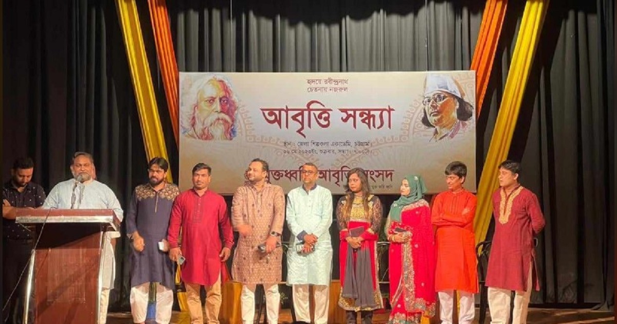 “হৃদয়ে রবীন্দ্রনাথ চেতনায় নজরুল” শীর্ষক আবৃত্তি সন্ধ্যা। শুক্রবার, ২৬ মে সন্ধ্যা ৭ টায় চট্টগ্রাম জেলা শিল্পকলা একাডেমির মুল মিলনায়তনে আবৃত্তি