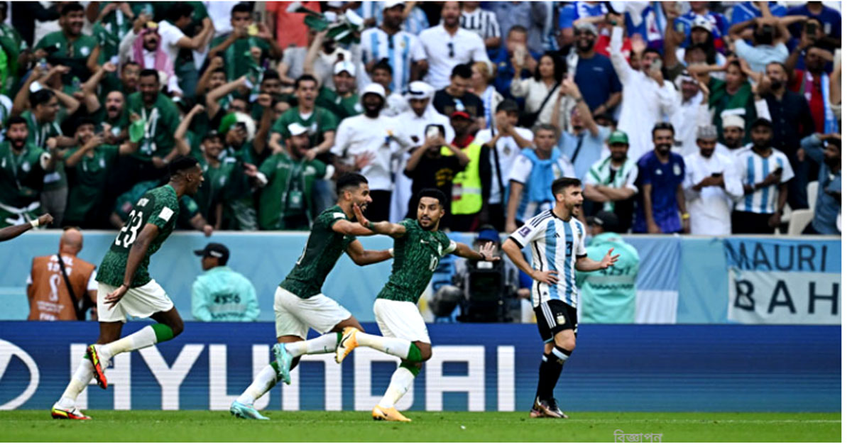 কাতার বিশ্বকাপে বড় অঘটনের জন্ম দিলো সৌদি আরব। র্যাঙ্কিংয়ের ৫১ নম্বরে থাকা গ্রিন ফ্যালকনরা ২-১ ব্যবধানে হারিয়ে দিয়েছে আর্জেন্টিনাকে। বিশ্বকাপের