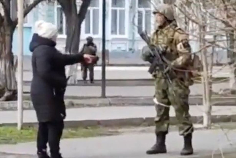 রুশ সেনার মুখোমুখি হয়ে ইউক্রেনে নারীর প্রতিবাদ