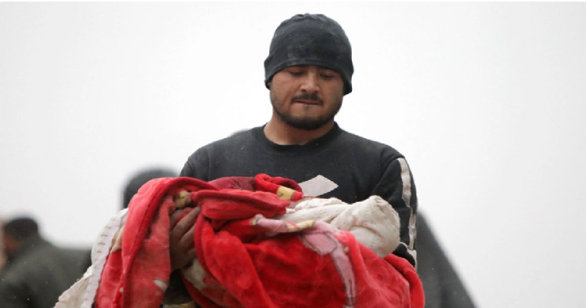একজন সিরিয়ান বিদ্রোহী নিয়ন্ত্রিত সিরিয়ার উত্তর-পশ্চিমাঞ্চলীয় শহর আফরিনে ভূমিকম্পে নিহত একটি শিশুর মরদেহ বহন করছেন। ছবি : বকর আলকাসেম/এএফপি সোমবার