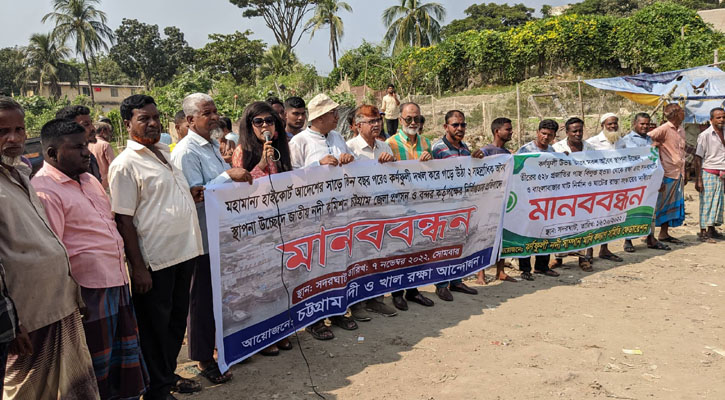 হাইকোর্টের নির্দেশ অনুযায়ী কর্ণফুলীর দুই সহস্রাধিক অবৈধ স্থাপনা আগামী ১৫ দিনের মধ্যে উচ্ছেদের দাবি জানিয়ে সদরঘাটে মানববন্ধন করেছে চট্টগ্রাম নদী