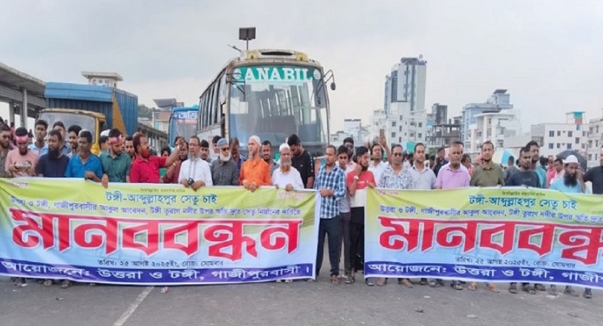 গাজীপুরের টঙ্গীবাজারে তুরাগ নদীর ওপর নতুন সেতু নির্মাণ এবং খানাখন্দে ভরা সড়কের সংস্কারের দাবিতে সোমবার সকালে ব্যাপক বিক্ষোভ ও মানববন্ধন