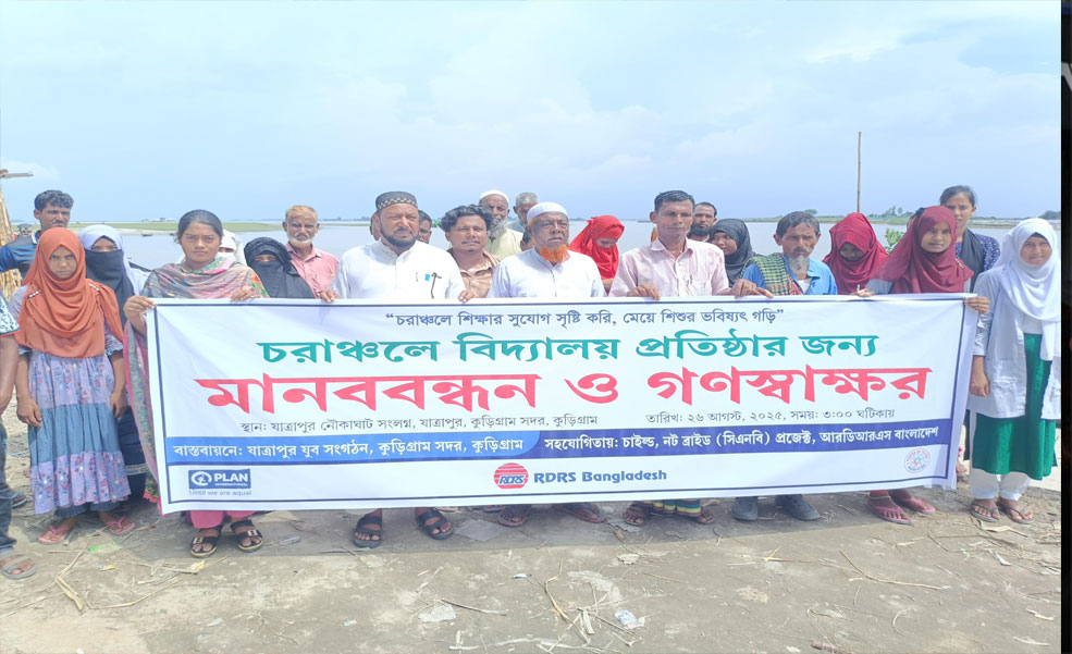 “চরাঞ্চলে শিক্ষার সুযোগ সৃষ্টি করি, মেয়ে শিশুর ভবিষ্যৎ গড়ি” এই শ্লোগানে কুড়িগ্রামের চরাঞ্চলে বিদ্যালয় প্রতিষ্ঠার দাবিতে মানববন্ধন ও গণস্বাক্ষর অনুষ্ঠিত