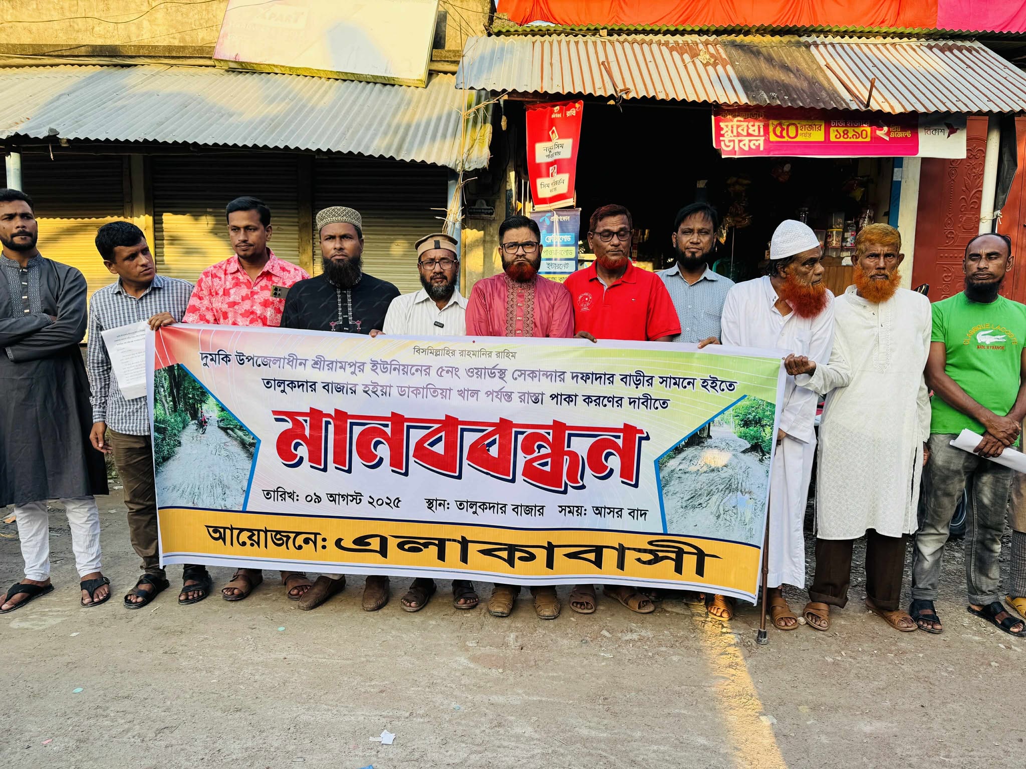 দুমকিতে রাস্তা পাকাকরণের দাবিতে এলাকাবাসীর মানববন্ধন