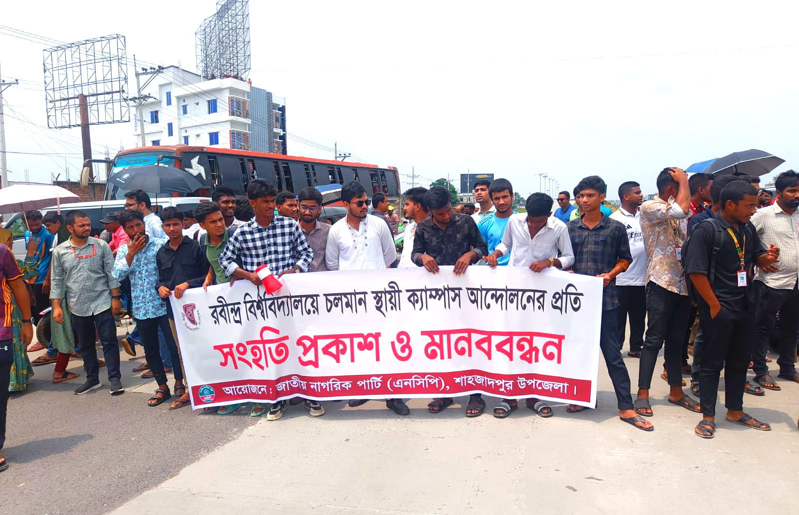 রবীন্দ্র বিশ্ববিদ্যালয়ের স্থায়ী ক্যাম্পাস নির্মাণের ডিপিপি দ্রুত অনুমোদন ও পূর্ণ বাস্তবায়নের দাবিতে রবীন্দ্র বিশ্ববিদ্যালয়ের সাধারণ শিক্ষার্থীরা হাটিকুমরুল হাইওয়েতে ঢাকা-উত্তরবঙ্গ মহাসড়ক